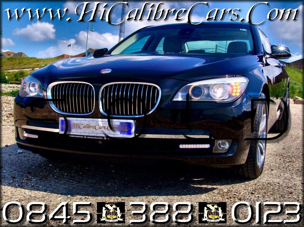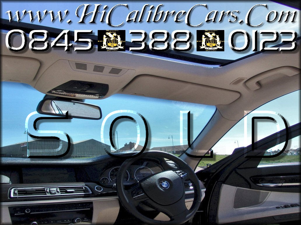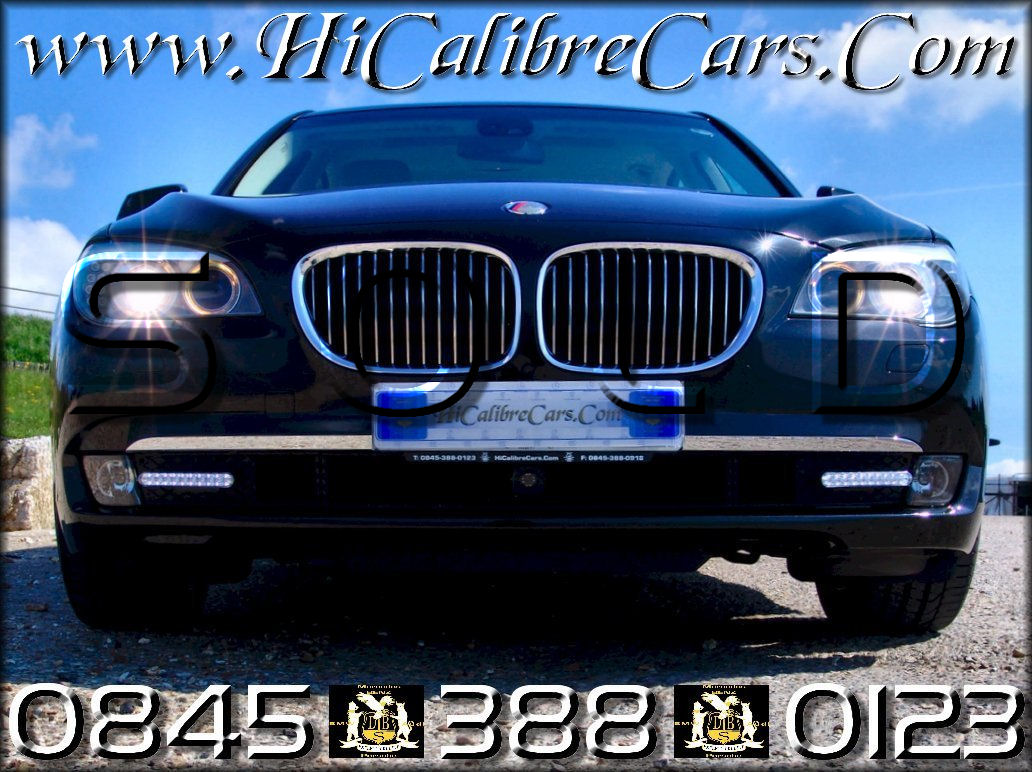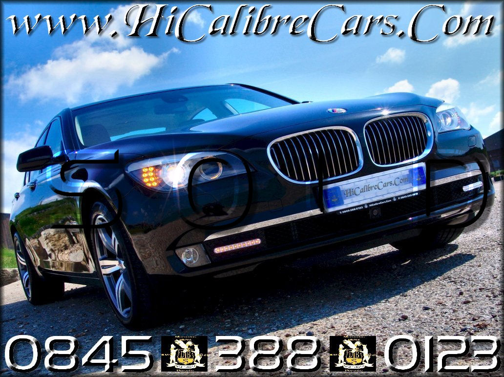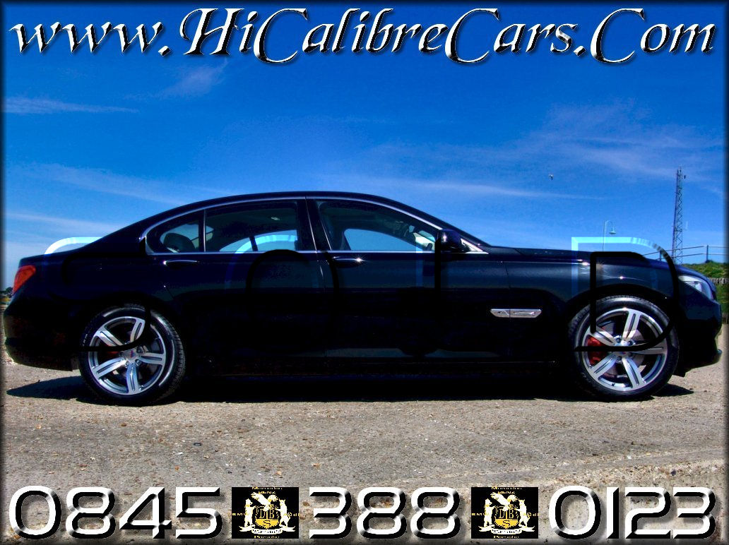 \\VAT Qualifier// 2010[60] BMW 740d [F-01] Twin-Turbo Diesel FaceLIFT 4 Door saloon, 8 Speed Automatic. 3.0 Litre, 6 Cylinder In-Line 24-Valve DOHC, 306BHP/600Nm, Sequential Twin-Turbo DIESEL. This mega-spec Twin-Turbo capable of delivering a cool 306BHP with a gigantuous effortless 600Nm of torque has now been SOLD. She is finished in SAPPHIRE Black Metallic with exclusive Oyster White/Black Dakota leather interior. There are currently not many comparable examples out there on the net that comes close to similar in magnitude of spec or stature to this top of the range of F01 currently advertised in the UK. She is referred to by BMW as best vehicle with individual paint & upholstery options. This brutal yet beautiful powerhouse, is a truly lively and sybaritic phantom-in-motion with a unique style with elegance that is the true and incomparable stealthy BMW Luxury saloon of all time. Her true stomping ground is unquestionably the motorway where this flagship par excellence; is effortless, quiet and cocoon like and is the ideal intercity express that easily beats taking the plane on distances of up to 300 miles. Her power plant is turbine smooth until you push the throttle two-thirds of the way toward the firewall when she suddenly erupts unleashing pure unadulterated Twin-TURBO power of over 300BHP to its rear wheels sling-shooting this gorgeous 2.5 ton luxo-screamer 0 to 60mph in an incredible 6.0 seconds or in simpler terms; nought to delicious in no time at all. This überdiesel is the epiphany of blend and functionality. This car is a technological showcase for BMW, a company that now feels confident enough to put its rivals ruthlessly in their place. As a candidate for one of the best luxury cars in the world, it's tough to think of anything that can top this 3.0 litre 40mpg rear-wheel drive motorway king. Add to this a gigantic twisting force in the form of humongous mid-range torque of 600Nm enough to lug an oil rig off its moorings plus a deliciously snarly twin exhaust that puts a manic grin on any ones face, you effortlessly accelerate like a cheetah on the hunt, your senses are re-assured as this power is effortlessly and flawlessly poured through her rear paws. An incomparable stunner created by Munich with no Achilles heel - simple. Her extensive specification includes: Smoked Glass Sun-Roof/ SatNAV Professional/ Reverse Parking Aid Colour Camera/ Front Night Vision Colour Camera/ Digi_TV/ Lane Departure Warning System/ Surround Sound system with MultiMedia interface with Digi-DAB Radio / Designo side air-intake-vents/ DVD movie player/ Front & Rear parking sensors with colour displays/ Park speed sensitive power assisted steering/ Bluetooth GSM Phone controlled via iDrive interface/ CD player with MP3 facility and BMW Professional Multimedia Navigation system featuring shortcut and Favourite buttons, and multi-channel amplifier with BMW audio system/ COMBOX Controller/ ABS+ BAS+ ESP +SBC/ Full AutoClimate Control/ Auto-dimming interior & exterior mirrors/ Bi-XENON lights with Cornering/Bending Light Function + Wash + Dynamic Range adjustment/ Daylight Running Lights/ New Designo Multi-Spoke 19” Black Anthracite & Diamond-Cut Highly Polished Alloys with Hi-Performance tyres/ Tinted glass + Privacy Glass/ Interior Motion Sensors/ Electric Heated front seats height + lumbar adjustment/ Electric windows with 1-touch facility/ Designo HCC pure silver badging in cabin/ 6-CD/DVD multi-changer/ BMW Connected Drive Assist with TeleServices/ Rain Sensing wipers/ 8-Speed Automatic Transmission with Selectric Gear Change + Tiptronic Paddle-Shift Functions/ Tempomat with Brake Function/ iPhone & iPod Connections with USB Interface/ Engine Start-Stop button with Key insert function/ Hill Start Assist/ Valid SERVICE Pack / Adaptive brake lights/ Voice control system/ Tyre pressure sensors/ Height + Reach + Rake adjustment steering column/ Luxury MSport Multi-Function steering wheel/ Fine Wood trim Fine-Line High Gloss Finishes finishes/ Comfort access seating with memory functions.. Extras list on this car goes on & on. Please click on links below for detailed information on the car including Specification sheet, V5C and a captivating narrative on this stunner in order to appreciate its incredible value ::::::::> To view over 90 High Definition images please clink on the Link ::::::::> http://www.hicalibrecars.com/2560x1600/bx60xpc.php