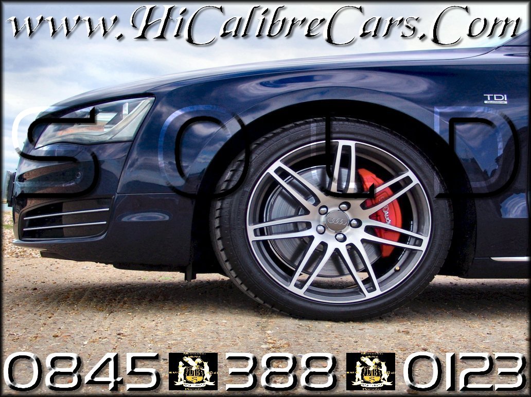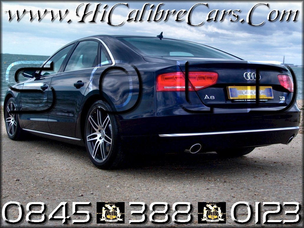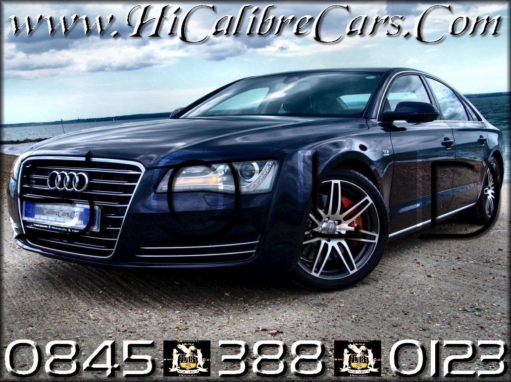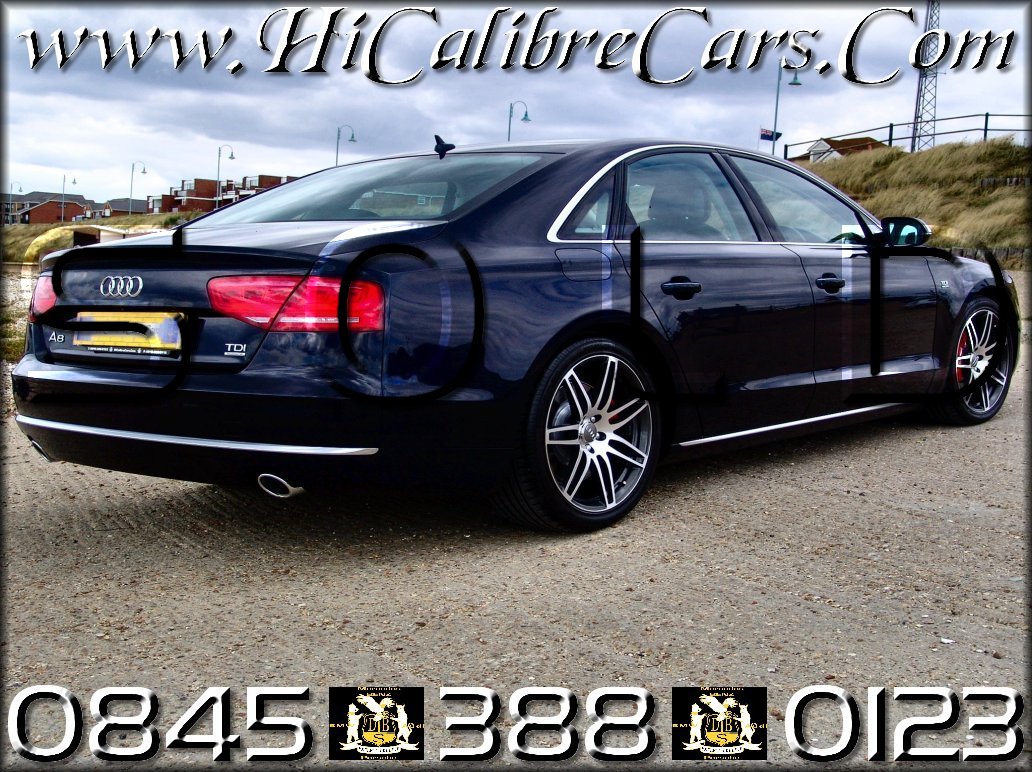 \\VAT QUALIFIER// 2010 [60] AUDI – A8 4.2 TDi Quattro – SE FaceLift 4-Door Saloon. v8 32valve Turbo DIESEL, 350BHP, 800Nm 8Speed Tiptronic Auto. This one owner Audi Flag-ship has now been SOLD. She was so highly specified that no other car currently advertised on the net came anywhere close to similar in magnitude of spec and exclusivity. She comes with F/A/S/H + 32500 warranted miles. Finished in exquisite Night Blue Pearl metallic with soft Black/Grey nappa supple leather interior. This like new MEGASPEC Audi flagship has nothing out there that even comes close to similar in magnitude of Spec and Exclusivity. When new she is believed to have cost well over £75K. The car has been fully serviced from new on 3 separate occasions by Audi and the last service was carried out only recently. The exclusive spec includes Front Night Vision Colour Camera/ Rear Vision Colour Colour Camera with guide lines & sensor Displays/ HDD Satellite Navigation System Pro MID with Touchpad controls/ Digi-TV/ Digi-DAB Radio/ Front & Rear Park distance control with PICTOGRAM Displays/ Multi-Media Entertainment System with iPhone, iPod, iPad control/ DVD – Movie Player/ Bluetooth Telematics GSM phone system/ Sports suspension system/ NEW 20” Seven-Twin spoke AUDI Designer alloys with 275/35 ZR20 102Y High Performance Extra Load Sports CONTACT-2 tyres engineered by CONTINENTAL in Germany/ Flat Tyre Indicators/ Keyless-GO with Finger Press Start/Stop button, Open/Close functions/ LED Day Running Lights/ Bluetooth Audio Feed System/ BOSE S/S System with Voice Control/ Electric Pop-up Sun Roof/ DriveSelect with Comfort, Auto, Dynamic Electronic Chassis Control modes/ Electro-Mechanical Parking Brake/ MMI ‐ Multi Media Interface control system with HDD/ Six CD/DVD Auto‐changer for movies & MP3 Player CDs/ Xenon Dynamic Bending Headlights/ Adaptive 4-corner air suspension with electronic shock absorption control/ Comfort Sports Seats with complete electromechanical control functions/ Regenerative Breaking System 12.5V/ Boot Lid auto release with soft-touch servo-close function/ Electronic climate control (ECC)/ Heated seats with lumbar functions with individual controls/ Memory Seats in the Front - Driver + Passenger. LIST GOES ON & ON. This one owner Audi Flag-ship has now been SOLD. - PLEASE click "View Options & Features" below for complete Options & Extras DATA sheet & click on "View Narrative" below for a Full and descriptive as well as informative NARRATIVE on this INCREDIBLY UNIQUE bespoke STUNNER. =>=>=> To view over 90 HIGH DEFINITION images please clink on the Link =>=>=> http://www.hicalibrecars.com/2560x1600/ld60lyh.php